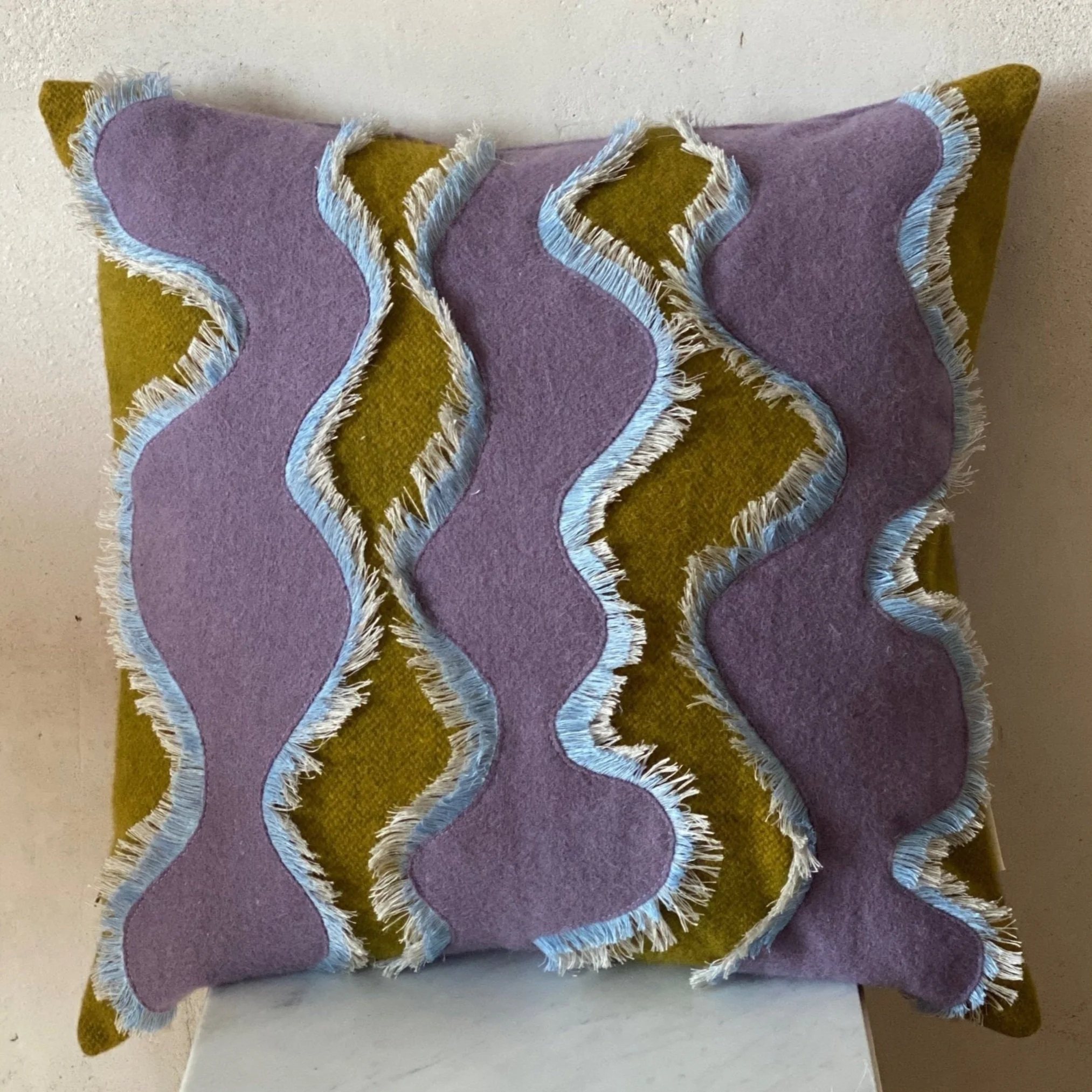 Recycled 100% wool and 100% linen fringe from reused industrial waste. 50 x 50cm. Zip closing and down inner cushion. Hand wash in 30 degrees C and style fringes when wet.